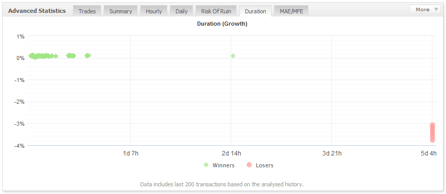 The Myfxbook paints another picture in our mind where we observe the use of no stop loss and poor risk management. While trading with a high lot size can cause a high drawdown on the portfolio, which is evident from the live stats. The algorithm is most active during Wednesdays and trades towards the end of the New York session